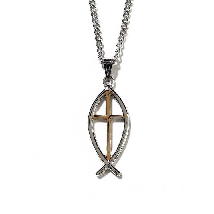 A silver open fish frames a gold cross. Silver/gold plated pendant is 7/8″”; silver plated chain is 18″”. Deluxe gift box.
