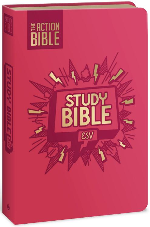 This newly revised design of the complete ESV translation, paired with full-color illustrations from The Action Bible throughout, includes engaging special features such as memory verses and games to help kids ages 8 and up discover the joy of reading and understanding God’s Word. In this completely refreshed design of the ESV translation of The Action Bible Study Bible, 40 vivid, full-color illustrated pages by comic book artist Sergio Cariello bring Scripture to life for preteens. Along with new maps, an all-new interior design, updated chapter introductions for every book of the Bible, and brand-new premium covers ready for personalization, this full-text Bible also includes a dictionary, a concordance, a user-friendly index, and colorful features designed for young readers, such as: What About This? Insights to tough questions about faith. Memorize This: Pull-out verses for memorizing. More to the Story: Who did what, when, where … and why it matters. Guess It: Person, place, or thing? Guessing fun with 5 clues. Take Action: Reflections on how Scripture passages apply to life today. Facts from the Past: Learn more about clothes, houses, weapons, food, celebrations, and traditions in Bible times. Best of all, The Action Bible Study Bible ESV connects young readers to illustrations and passages from their treasured Action Bible, igniting their imaginations while building a foundation of faith.