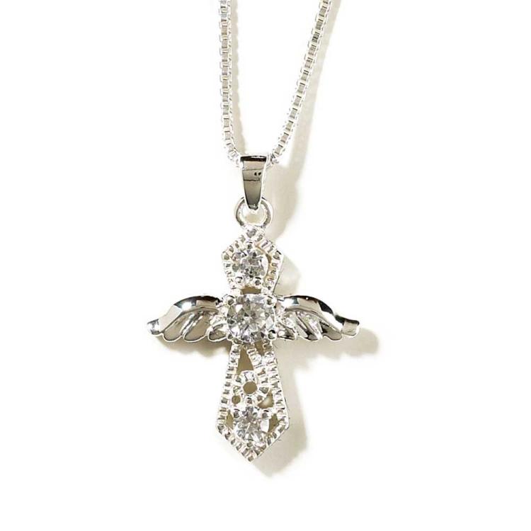 Lovely angel in the shape of a cross has three sparkling cubic zirconia accents. Silver plated 3/4″” cross on 18″” silver plated chain. Deluxe gift box.