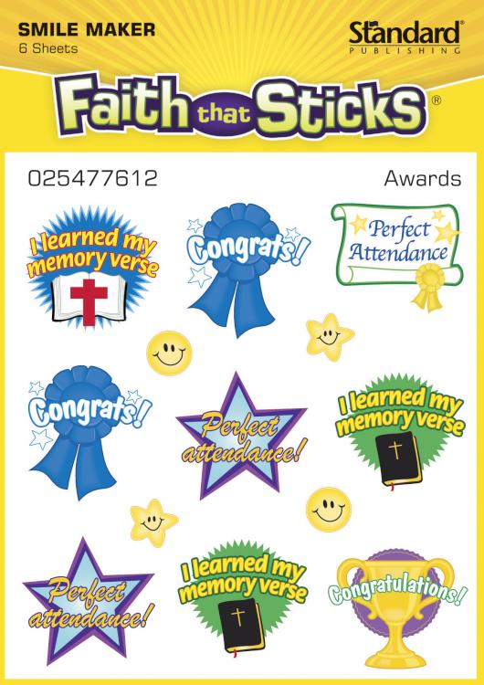 Award and recognition stickers are a fun and easy way to honor kids’ special achievements. Boys and girls will proudly wear these stickers for I learned my memory verse, Perfect attendance, or Congratulations. Great for Sunday school, teachers, and parents. Nine award stickers measuring approx. 1″ x 1″ plus 4 smiley face accent stickers. Six sheets, 13 stickers per sheet; 78 stickers per package.