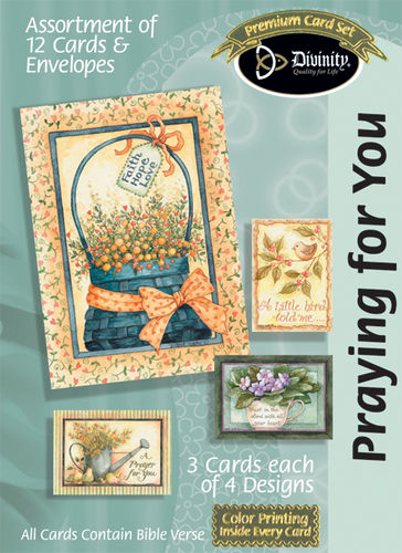 Brighten the spirits of loved ones with an inspirational card from Divinity Boutique’s Premium Card Series. Cards feature the charming watercolor artwork of Diane Knott, encouraging sentiments and a specially selected Scripture quotation. Box of 12; 3 each of 4 designs; measure 4.75″ w x 6.5″h; NIV.