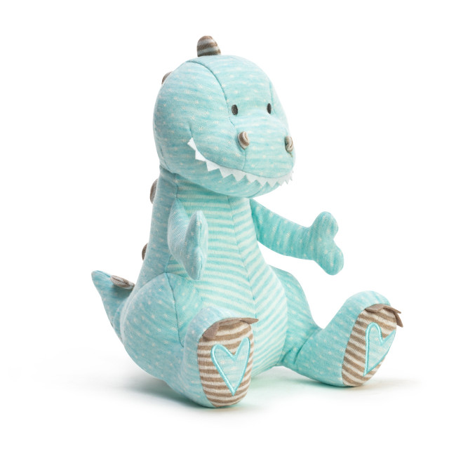 A darling blue dinosaur stuffed animal designed with soft jersey-knit fabric. With embroidered eyes, nose and hearts on the bottom of its feet, this stuffed animal will be a child’s new best friend. A heartfelt baby shower gift.