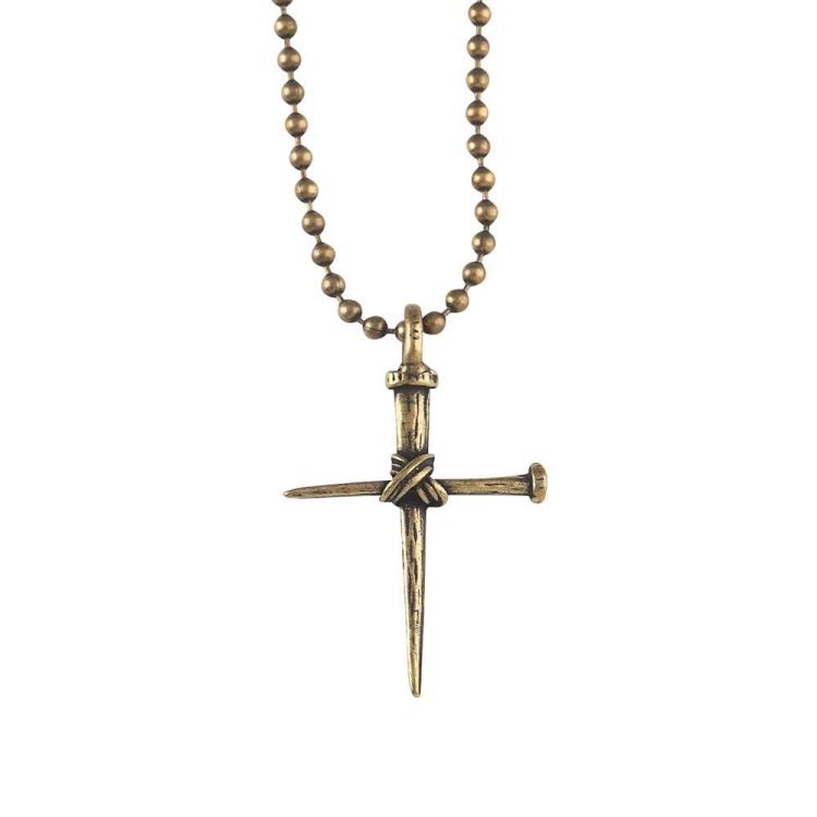 Brass Ox Plated 1 1/4 inches Pewter Nail Cross Necklace on 24 inch Ball Chain. Comes in black fabric covered deluxe gift box.