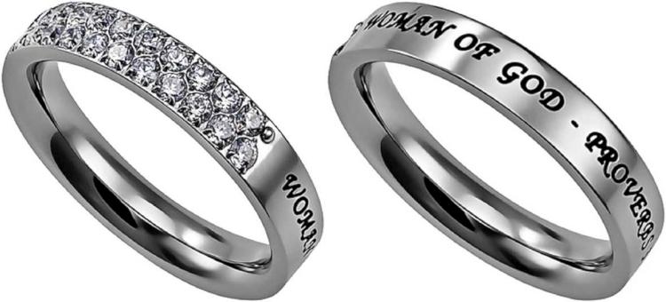Masterfully Constructed Stainless Steel Ring With Pave Stone Settings Across 5mm Band. Back Side Of Ring Has Woman Of God Proverbs 31 Engraving And Black Enamel Filling.