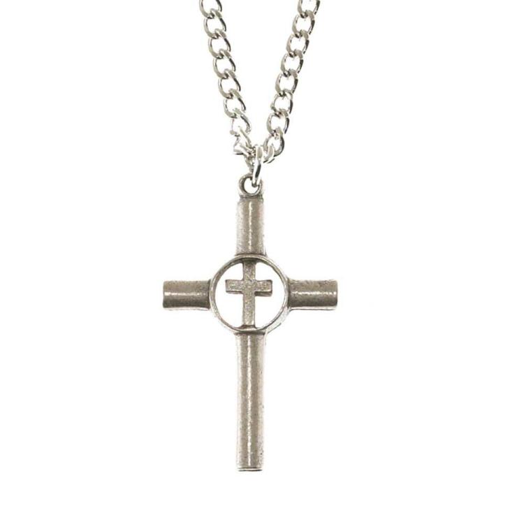 Pewter Cross with Cutout Cross Necklace on 24 inch Stainless Steel Chain