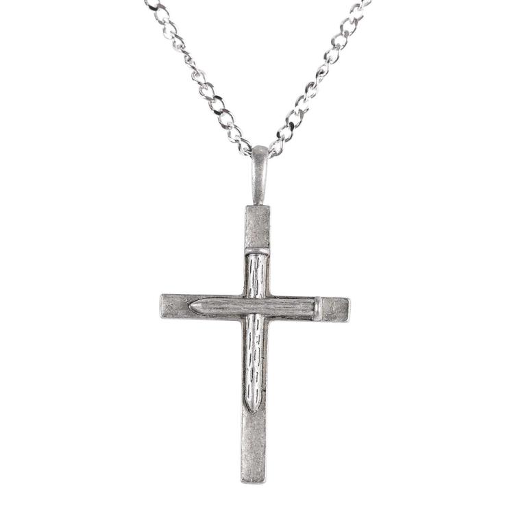 Plain smooth cross is the backdrop for a raised textured cross with the look of two nails. Pewter pendant is 1 7/8″”; stainless steel chain is 24″”. Deluxe gift box.