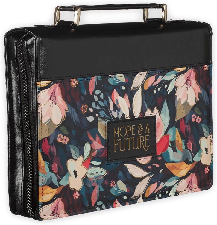 The Hope and a Future Botanical Midnight Faux Leather Fashion Bible Cover is part of the Hope and a Future Midnight Botanical Collection, which includes a stainless steel travel tumbler with a reusable straw, a faux leather checkbook cover, a spiral journal, a zippered faux leather journal, a gift bag, a faux leather bookmark, and a faux leather Bible cover.