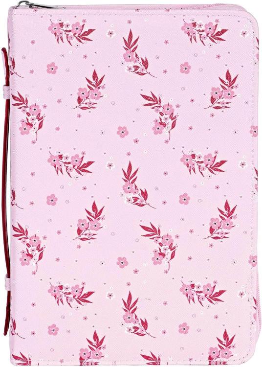 This Pink Bible Case Is Made From Polyurethane, In Hard-Shell Style, With A Delicate Floral Pattern. Has Lay-Flat Construction, With A Cross Zipper Pull. The Zipper Is Non-Rusting And Self-Repairing. This Cover Boasts Nylon Reinforced Stitching Plus A Side Carrying Handle. Inside Is An Elastic Pen Loop To Keep Your Pen Secure. The Handle Features Text: Prayer Changes Everything. XLarge Size: 10-1/4 X 2 X 7-1/4.
