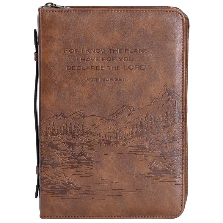 This Brown Bible Case Is Made From Polyurethane, In Hard-Shell Style. Has Lay-Flat Construction, With A Cross Zipper Pull. The Zipper Is Non-Rusting And Self-Repairing. This Cover Boasts Nylon Reinforced Stitching Plus A Side Carrying Handle. Inside Is An Elastic Pen Loop To Keep Your Pen Secure. The Front Has A Scenic Design With Jeremiah 29:11: For I Know The Plans I Have For You, Declares The Lord. Large Size: 9-3/4 X 1-3/4 X 6-3/4.