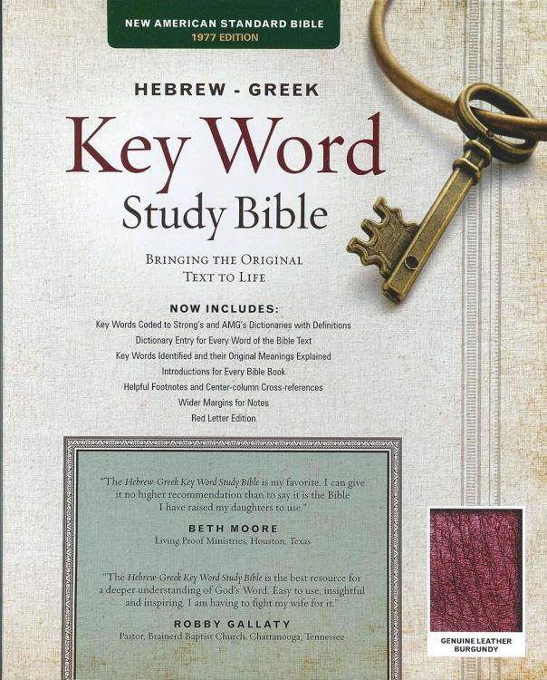 There are times when a Greek or Hebrew word has a distinct meaning that seriously affects the proper interpretation of Scripture. Unless you are familiar with these languages, you will not be able to determine what word in the original text was used or the differences between these words-until now.The Hebrew-Greek Key Word Study Bible identifies the key words of the original languages and presents clear, precise explanations of their meaning and usage. Those who love God’s Word will treasure this Bible, for it contains a whole library of biblical helps within its covers. NOW INCLUDED* Wider Margins on Pages of the Bible Text* Key Words in the Biblical Text Coded to Strong’s Numbers* New Word Studies with AMG’s Annotated Strong’s Dictionaries* Red Letter Edition of the New American Standard BibleGENUINE LEATHER BURGUNDY INDEXED