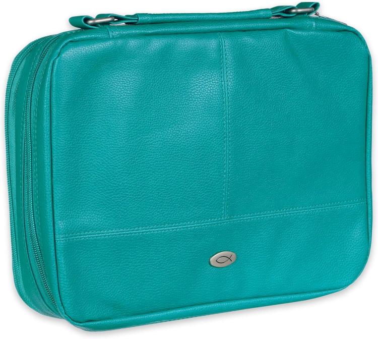 Add a refreshing pop of color to Bible study with the Two-Fold Turquoise Faux Leather Organizer Bible Cover the perfect blend of style and functionality for a woman on the go.