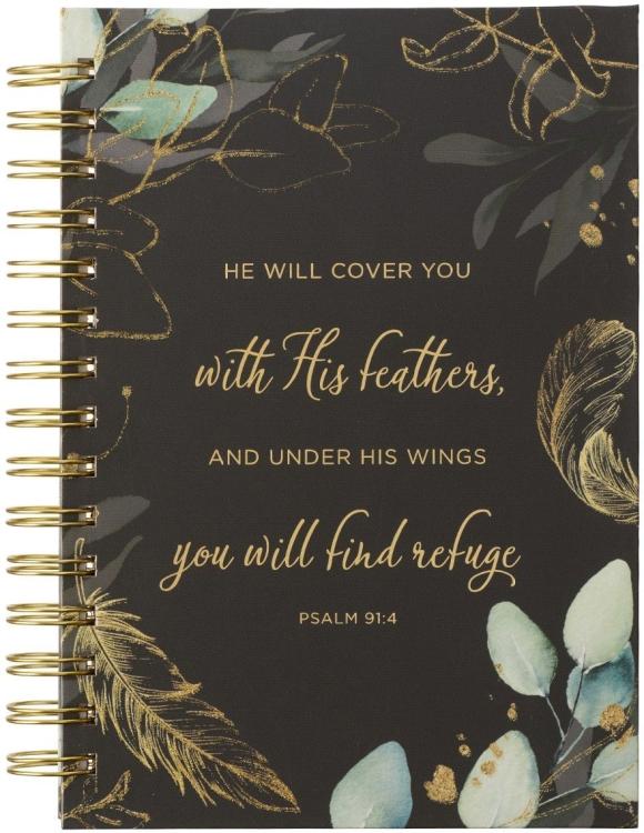 Rest in the care of the Almighty as you journal your prayers and praises in the Find Refuge Black and Gold Feather Large Spiral Journal.
