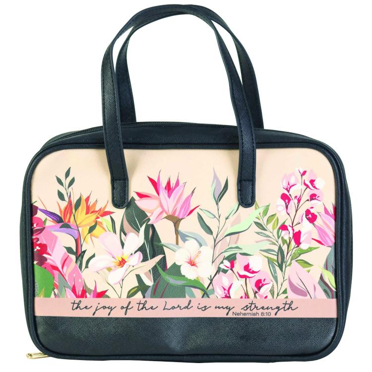 Handbag style Bible cover features peach/floral accents on the overall black-colored body. Features Nehemiah 6:10: The joy of the Lord is my strength. Size Large.