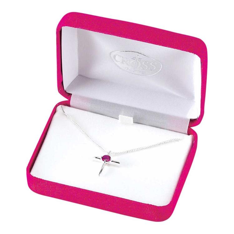 Enjoy honoring her birthday with the look of her own special birthstone on a cross necklace. Slender silver plated cross is about 13/16″” long and has a self vale for the 18″” chain. Comes in a bright pink gift box; inside the box (under necklace insert) is a sheer white organza drawstring bag and Happy Birthday card that that you can write your own message inside. Just place box and card in bag and it’s all ready to give!