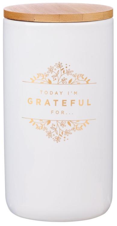 The smooth white ceramic gratitude jar is topped with a tightfitting bamboo lid with a silicone seal. The sentiment is gold foiled on the front of the jar.