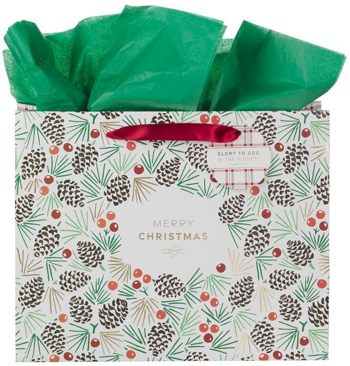 Acknowledge God’s great gift to mankind when you wrap your gifts in the Merry Christmas Pinecone Large Landscape Gift Bag.