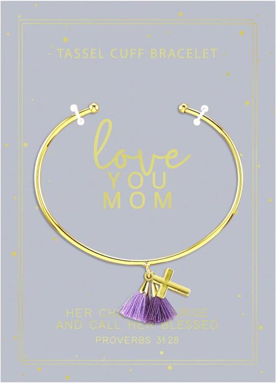 Pretty cuff bracelet with colorful tassel trim and cross charm