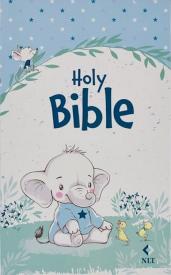 The most adorable baby elephant, donned in a cozy blue sleepshirt, graces the front cover of this hardcover Bible. Beneath a starry night sky, two cheerful yellow ducklings accompany the elephant while a mouse perches on a tree branch that gracefully extends over the embossed navy blue title. The version reference is located in the lower right-hand corner.