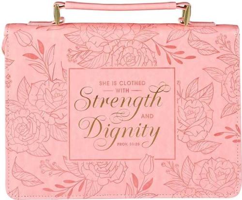 Protect your precious Bible in a stylish case with a beautiful design when you choose the Strength and Dignity Rose Pink Faux Leather Bible Cover. This elegant scuff-resistant Bible case will protect your Bible for years to come.