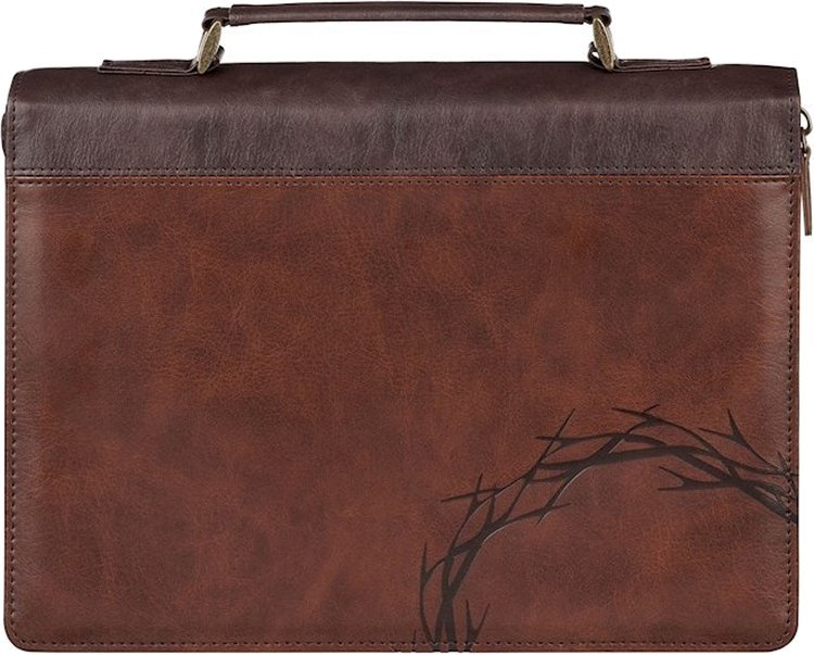 The Bible case has a two-tone brown design with a chestnut brown font cover that is heat-debossed with a crown of thorns in the lower right corner. This panel is connected to espresso-brown faux leather that wraps around the spine and fills the back. Durable topstitching around the edges and the seams ensures a strong connection. The back cover has a slip pocket, where you will find a gold-foiled Scripture verse to support the cover design.