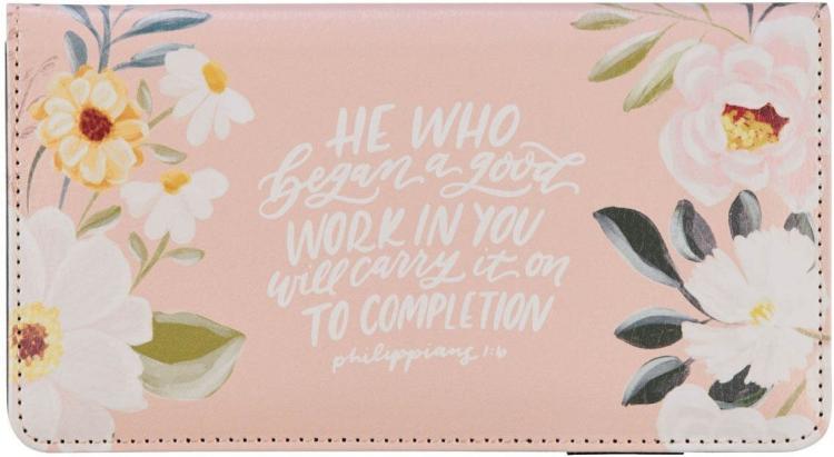 With its elegant floral design and uplifting message~ the A Good Work Peach Floral Faux Leather Checkbook Wallet is designed to organize your financial essentials in style. This beautiful peach checkbook wallet will remind you that spiritual transformation and renewal through the Holy Spirit are a lifelong process undertaken and perfected by Christ until the day of His return.