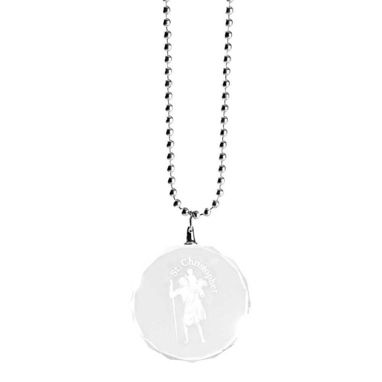 1 3/4 inches Round Etched Glass with Bead Chain – Poly Bag w/Black Paper Insert Card – St. Christopher By Jeweled Cross