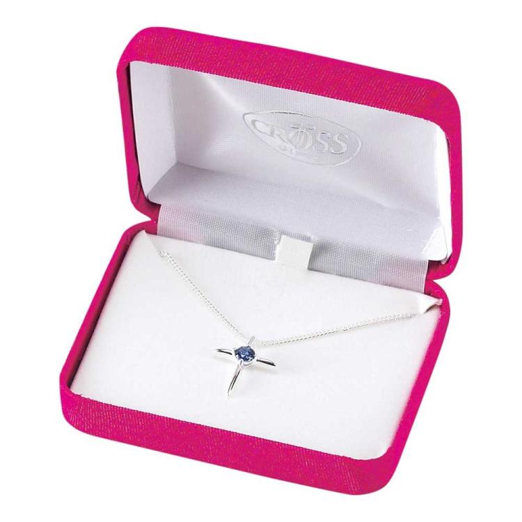 Enjoy honoring her birthday with the look of her own special birthstone on a cross necklace. Slender silver plated cross is about 13/16″” long and has a self vale for the 18″” chain. Comes in a bright pink gift box; inside the box (under necklace insert) is a sheer white organza drawstring bag and Happy Birthday card that that you can write your own message inside. Just place box and card in bag and it’s all ready to give!
