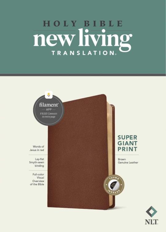 An exciting addition to Tyndale’s Bible collection, the NLT Super Giant Print Bible, Filament-Enabled Edition offers easy-to-read 16-point type, the words of Jesus in red, a full-color visual overview of the Bible, and translation notes with minimal interruptions for a comfortable reading experience. Now available in this Genuine Leather edition!What does Filament-Enabled Edition mean? For no extra cost, the NLT Super Giant Print Bible offers much more than you can hold in your hand, thanks to the groundbreaking Filament Bible app. This app enables you to use your mobile phone or tablet to connect every page of this Bible to a vast array of curated content, including thousands of study notes and hundreds of devotionals, plus interactive maps, informative videos, and inspiring worship music. The Filament Bible app turns this Bible into a powerful study and devotional experience, offering more to expand your mind and touch your heart than you can possibly hold in your hand.The New Living Translation is a clear and trusted English translation of the Bible. It conveys the precise meaning of the original languages in a flowing, effortless writing style that promotes comfortable and meaningful reading.