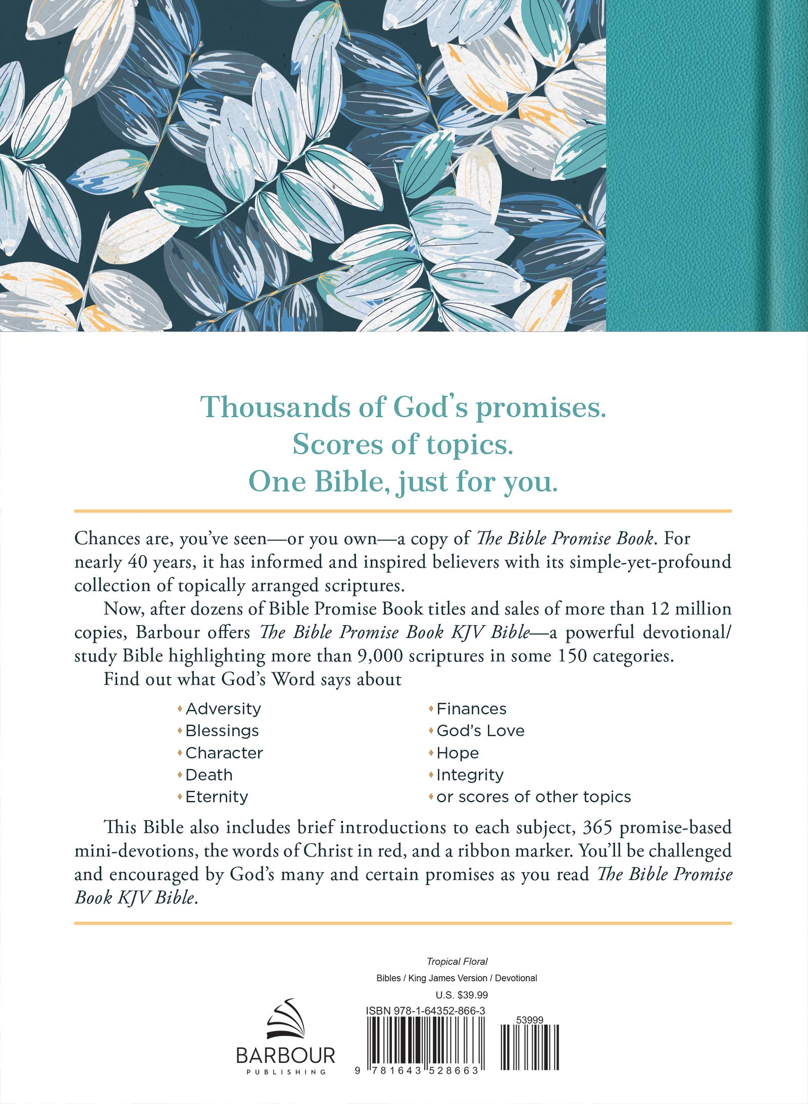 Chances are, you’ve seen—or you own—a copy of Barbour’s Bible Promise Book®. For nearly 40 years, it’s informed and inspired believers with its simple-yet-profound collection of topically arranged scriptures. Now, after dozens of Bible Promise Book titles and sales of more than 12 million copies, Barbour offers The Bible Promise Book KJV Bible—a powerful devotional/study Bible highlighting more than 9,000 scriptures in some 150 categories.