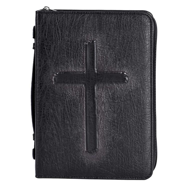 This Black Bible Case Is Made From Polyurethane, In Hard-Shell Style. Has Lay-Flat Construction, With A Cross Zipper Pull. The Zipper Is Non-Rusting And Self-Repairing. This Cover Boasts Nylon Reinforced Stitching Plus A Side Carrying Handle. Inside Is An Elastic Pen Loop To Keep Your Pen Secure. The Front Has A Vintage Embossed Cross. XLarge Size: 10-1/4 X 2 7-1/4.