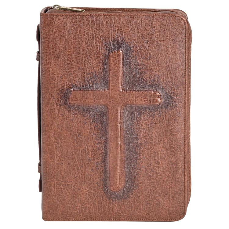 HARD SHELL STYLE- PU Bible cover . inside book mark & elastic pen loop; color brown, size L; vintage/embossed cross on cover