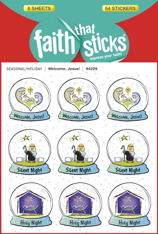 These snow-globe shaped stickers help kids welcome Jesus this Christmas, with scenes of the Nativity. Greetings include Welcome, Jesus; Silent Night; and Holy Night. Fun for Sunday school, preschool, holiday decorating, or gift wrapping, stickers are approximately 1″ x 1 ” each. Six sheets, 6 stickers per sheet; 36 stickers per package.