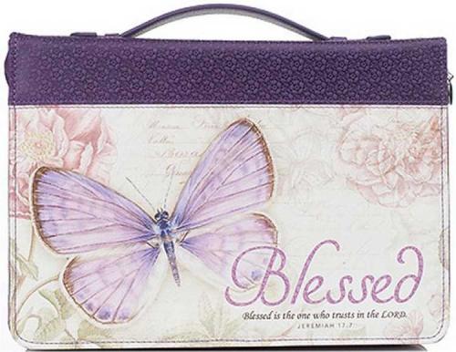The Blessed Purple Butterfly Blessings Faux Leather Fashion Bible Cover features the artwork of Jane Shasky. Fresh botanicals embellished with elegant calligraphy fashioned as a carte postale” serves as a background for a signature purple butterfly.”